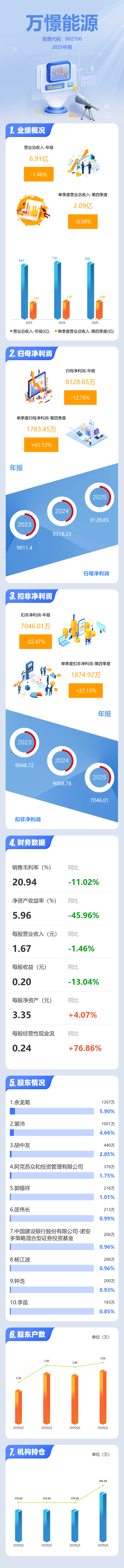 证券之星消息,万憬能源2025年年报显示,当年度公司主营收入6.91亿元,同比下降1.47%;归母净利润8128.65万元,同比下降12.77%;扣非净利润7046.01万元,同比下降22.48%;其中2025年第四季度,公司单季度主营收入2.09亿元,同比下降0.09%;单季度归母净利润1783.45万元,同比上升61.12%;单季度扣非净利润1874.92万元,同比上升27.13%;负债率13.59%,投资收益1532.52万元,财务费用-186.79万元,毛利率20.94%。