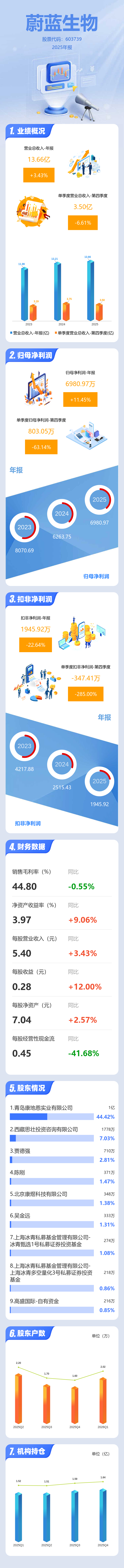 证券之星消息,蔚蓝生物2025年年报显示,当年度公司主营收入13.66亿元,同比上升3.43%;归母净利润6980.97万元,同比上升11.45%;扣非净利润1945.92万元,同比下降22.64%;其中2025年第四季度,公司单季度主营收入3.5亿元,同比下降6.61%;单季度归母净利润803.05万元,同比下降63.15%;单季度扣非净利润-347.41万元,同比下降285.0%;负债率37.14%,投资收益-33.06万元,财务费用1893.82万元,毛利率44.8%。