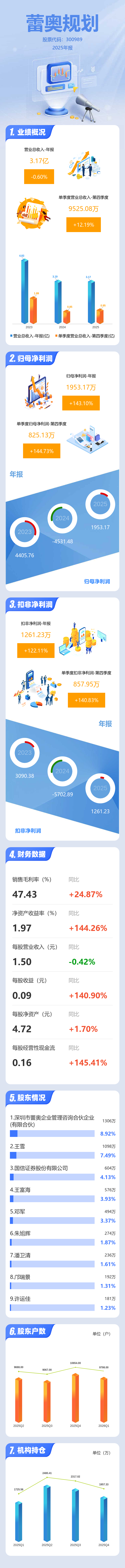 证券之星消息,蕾奥规划2025年年报显示,当年度公司主营收入3.17亿元,同比下降0.61%;归母净利润1953.17万元,同比上升143.1%;扣非净利润1261.23万元,同比上升122.12%;其中2025年第四季度,公司单季度主营收入9525.08万元,同比上升12.19%;单季度归母净利润825.13万元,同比上升144.73%;单季度扣非净利润857.95万元,同比上升140.83%;负债率19.6%,投资收益329.19万元,财务费用290.7万元,毛利率47.43%。