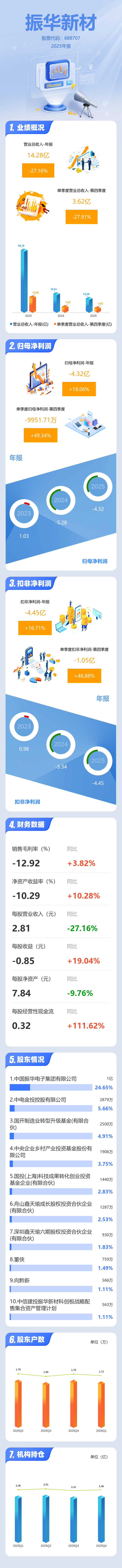 证券之星消息,振华新材2025年年报显示,当年度公司主营收入14.28亿元,同比下降27.16%;归母净利润-4.32亿元,同比上升18.06%;扣非净利润-4.45亿元,同比上升16.71%;其中2025年第四季度,公司单季度主营收入3.62亿元,同比下降27.92%;单季度归母净利润-9951.71万元,同比上升49.34%;单季度扣非净利润-1.05亿元,同比上升46.88%;负债率39.29%,投资收益-79.94万元,财务费用3899.35万元,毛利率-12.92%。