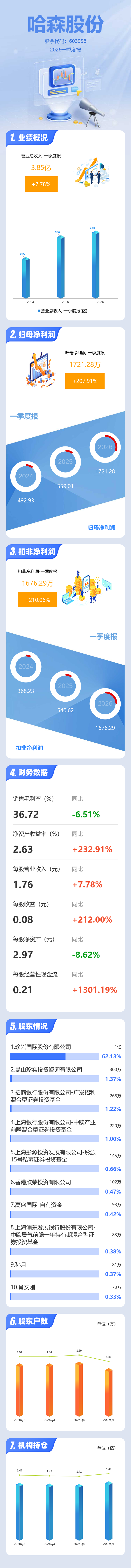 证券之星消息,哈森股份2026年一季报显示,一季度公司主营收入3.85亿元,同比上升7.78%;归母净利润1721.28万元,同比上升207.92%;扣非净利润1676.29万元,同比上升210.07%;负债率57.24%,投资收益256.96万元,财务费用491.96万元,毛利率36.72%。