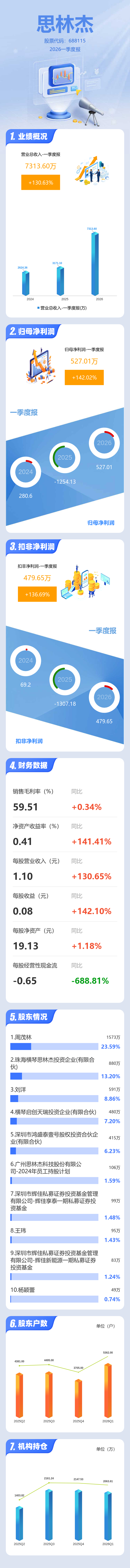 证券之星消息,思林杰2026年一季报显示,一季度公司主营收入7313.6万元,同比上升130.63%;归母净利润527.01万元,同比上升142.02%;扣非净利润479.65万元,同比上升136.69%;负债率7.56%,投资收益-0.61万元,财务费用153.05万元,毛利率59.51%。