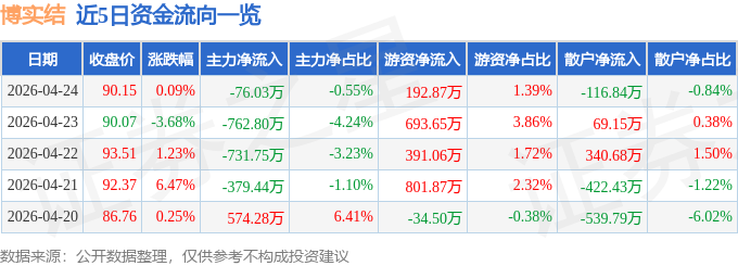 证券之星消息,截至2026年4月24日收盘,博实结(301608)报收于90.15元,上涨0.09%,换手率3.85%,成交量1.54万手,成交额1.39亿元。