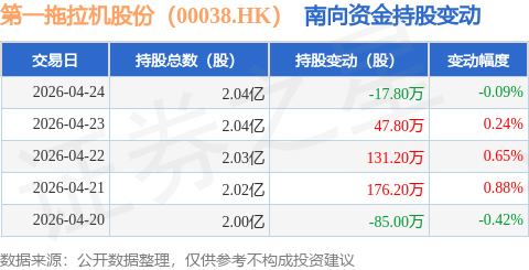 证券之星消息,4月24日南向资金减持17.8万股第一拖拉机股份(00038.HK)。近5个交易日中,获南向资金增持的有3天,累计净增持252.4万股。近20个交易日中,获南向资金增持的有11天,累计净增持556.13万股。截至目前,南向资金持有第一拖拉机股份(00038.HK)2.04亿股,占公司已发行普通股的51.96%。