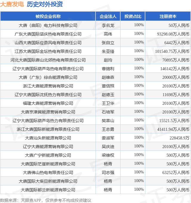 证券之星消息,根据天眼查APP显示,大唐发电(601991.SH)新增一起对外投资事件,被投资公司为大唐(曲阳)电力科技有限公司,法定代表人李名龙,投资占比为100%。该公司从事电力、热力生产和供应业,注册资本为50万人民币。目前,大唐发电共存在对外投资196项,投资占比前20的项目见下表: