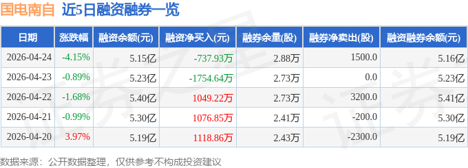 国电南自融资融券信息显示,融资方面,当日融资买入5346.53万元,融资偿还6084.45万元,融资净偿还737.93万元。融券方面,融券卖出1500.0股,融券偿还0.0股,融券余量2.88万股,融券余额43.26万元。融资融券余额5.16亿元。