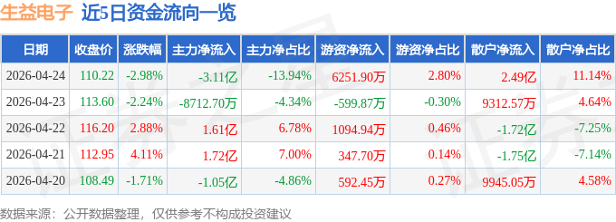 证券之星消息,截至2026年4月24日收盘,生益电子(688183)报收于110.22元,下跌2.98%,换手率2.38%,成交量19.84万手,成交额22.32亿元。