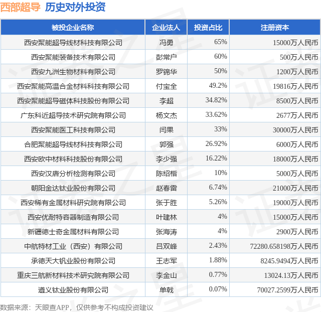 证券之星消息,根据天眼查APP显示,西部超导(688122.SH)新增一起对外投资事件,被投资公司为合肥聚能超导线材科技有限公司,法定代表人郭强,投资占比为26.92%。该公司从事计算机、通信和其他电子设备制造业,注册资本为6000万人民币。目前,西部超导共存在对外投资18项,详见下表: