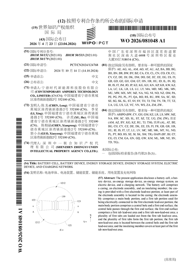证券之星消息,根据企查查数据显示宁德时代(300750)公布了一项国际专利申请,专利名为“电池单体、电池装置、储能装置、储能系统、用电装置及充电网络”,专利申请号为PCT/CN2024/124768,国际公布日为2026年4月23日。