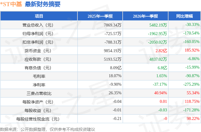 据证券之星公开数据整理,近期*ST中基(000972)发布2026年一季报。截至本报告期末,公司营业总收入5482.19万元,同比下降30.33%,归母净利润-1962.95万元,同比下降170.54%。按单季度数据看,第一季度营业总收入5482.19万元,同比下降30.33%,第一季度归母净利润-1962.95万元,同比下降170.54%。本报告期*ST中基三费占比上升明显,财务费用、销售费用和管理费用总和占总营收同比增幅达55.34%。