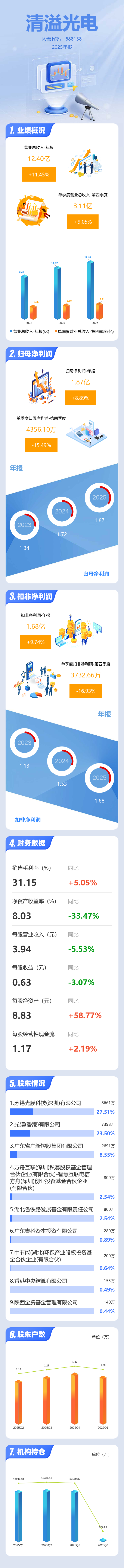 证券之星消息,清溢光电2025年年报显示,当年度公司主营收入12.4亿元,同比上升11.46%;归母净利润1.87亿元,同比上升8.89%;扣非净利润1.68亿元,同比上升9.75%;其中2025年第四季度,公司单季度主营收入3.11亿元,同比上升9.06%;单季度归母净利润4356.1万元,同比下降15.5%;单季度扣非净利润3732.66万元,同比下降16.94%;负债率28.94%,投资收益4.66万元,财务费用2405.93万元,毛利率31.15%。