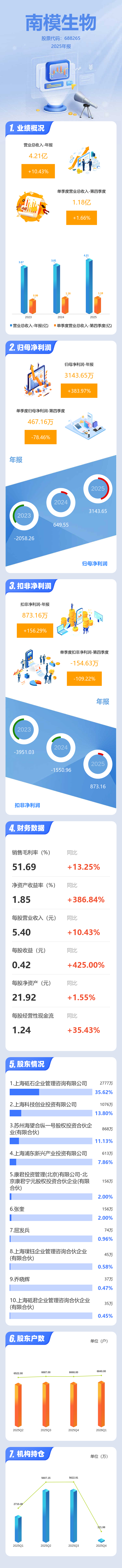 证券之星消息,南模生物2025年年报显示,当年度公司主营收入4.21亿元,同比上升10.44%;归母净利润3143.65万元,同比上升383.97%;扣非净利润873.16万元,同比上升156.3%;其中2025年第四季度,公司单季度主营收入1.18亿元,同比上升1.66%;单季度归母净利润467.16万元,同比下降78.46%;单季度扣非净利润-154.63万元,同比下降109.23%;负债率13.83%,投资收益177.52万元,财务费用204.37万元,毛利率51.69%。