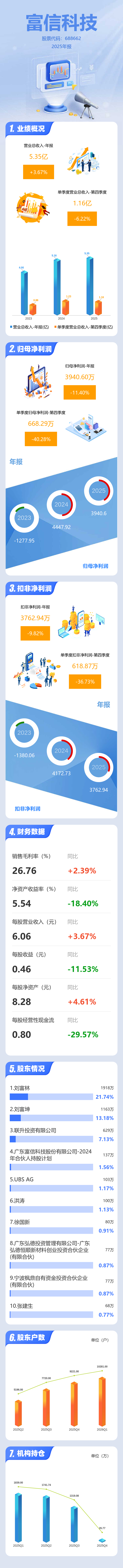 证券之星消息,富信科技2025年年报显示,当年度公司主营收入5.35亿元,同比上升3.68%;归母净利润3940.6万元,同比下降11.41%;扣非净利润3762.94万元,同比下降9.82%;其中2025年第四季度,公司单季度主营收入1.16亿元,同比下降6.22%;单季度归母净利润668.29万元,同比下降40.28%;单季度扣非净利润618.87万元,同比下降36.73%;负债率20.67%,投资收益31.73万元,财务费用-128.98万元,毛利率26.76%。
