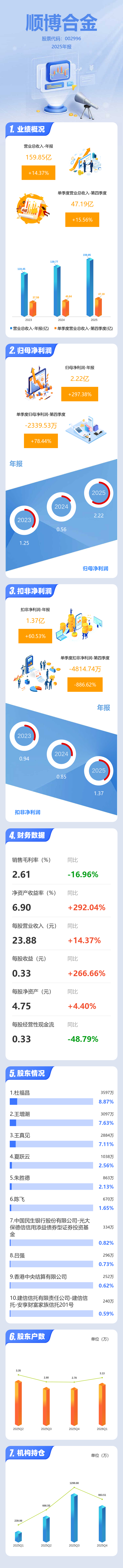 证券之星消息,顺博合金2025年年报显示,当年度公司主营收入159.85亿元,同比上升14.37%;归母净利润2.22亿元,同比上升297.39%;扣非净利润1.37亿元,同比上升60.54%;其中2025年第四季度,公司单季度主营收入47.19亿元,同比上升15.57%;单季度归母净利润-2339.53万元,同比上升78.45%;单季度扣非净利润-4814.74万元,同比下降886.63%;负债率78.2%,投资收益7703.78万元,财务费用1.38亿元,毛利率2.61%。
