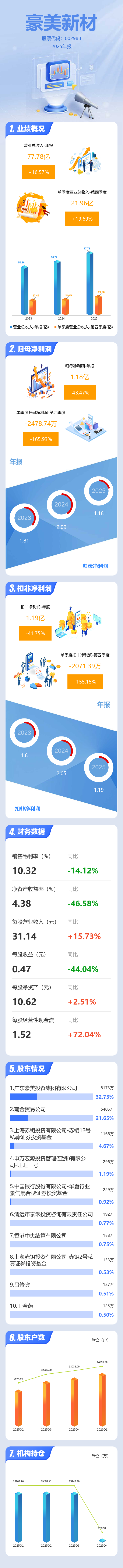 证券之星消息,豪美新材2025年年报显示,当年度公司主营收入77.78亿元,同比上升16.58%;归母净利润1.18亿元,同比下降43.47%;扣非净利润1.19亿元,同比下降41.76%;其中2025年第四季度,公司单季度主营收入21.96亿元,同比上升19.69%;单季度归母净利润-2478.74万元,同比下降165.94%;单季度扣非净利润-2071.39万元,同比下降155.15%;负债率60.54%,投资收益-925.08万元,财务费用9633.55万元,毛利率10.32%。
