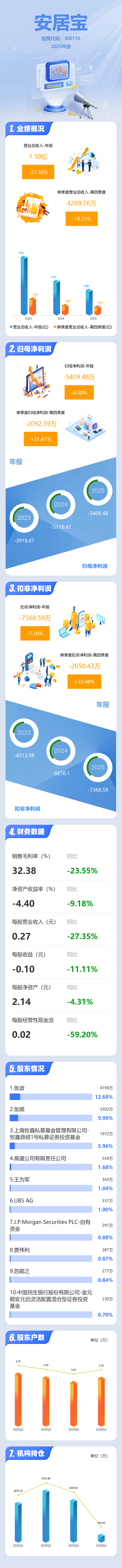 证券之星消息,安居宝2025年年报显示,当年度公司主营收入1.5亿元,同比下降27.37%;归母净利润-5409.48万元,同比下降4.5%;扣非净利润-7368.59万元,同比下降7.16%;其中2025年第四季度,公司单季度主营收入4289.76万元,同比下降18.23%;单季度归母净利润-2092.59万元,同比上升31.41%;单季度扣非净利润-2650.43万元,同比上升33.49%;负债率9.65%,投资收益1429.1万元,财务费用-545.22万元,毛利率32.38%。
