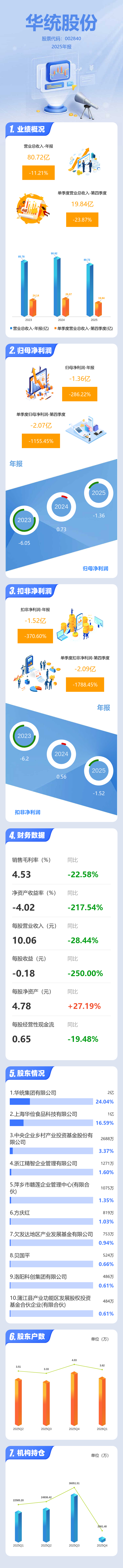 证券之星消息,华统股份2025年年报显示,当年度公司主营收入80.72亿元,同比下降11.22%;归母净利润-1.36亿元,同比下降286.23%;扣非净利润-1.52亿元,同比下降370.61%;其中2025年第四季度,公司单季度主营收入19.84亿元,同比下降23.88%;单季度归母净利润-2.07亿元,同比下降1155.46%;单季度扣非净利润-2.09亿元,同比下降1788.45%;负债率61.43%,投资收益-36.53万元,财务费用1.54亿元,毛利率4.53%。