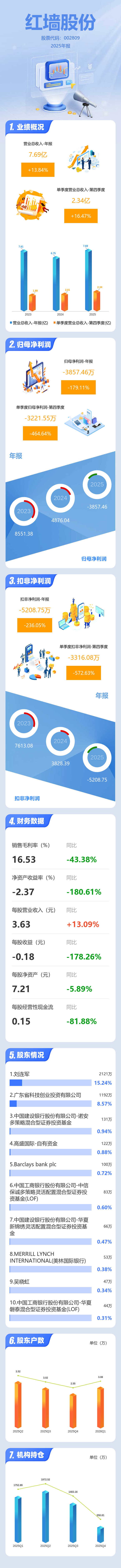 证券之星消息,红墙股份2025年年报显示,当年度公司主营收入7.69亿元,同比上升13.84%;归母净利润-3857.46万元,同比下降179.11%;扣非净利润-5208.75万元,同比下降236.06%;其中2025年第四季度,公司单季度主营收入2.34亿元,同比上升16.47%;单季度归母净利润-3221.55万元,同比下降464.64%;单季度扣非净利润-3316.08万元,同比下降572.64%;负债率39.07%,投资收益785.22万元,财务费用1993.44万元,毛利率16.53%。
