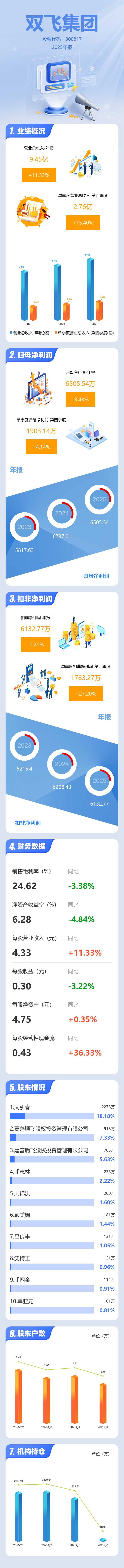 证券之星消息,双飞集团2025年年报显示,当年度公司主营收入9.45亿元,同比上升11.33%;归母净利润6505.54万元,同比下降3.44%;扣非净利润6132.77万元,同比下降1.22%;其中2025年第四季度,公司单季度主营收入2.76亿元,同比上升15.4%;单季度归母净利润1903.14万元,同比上升4.14%;单季度扣非净利润1783.27万元,同比上升27.2%;负债率20.1%,投资收益-31.49万元,财务费用-130.97万元,毛利率24.62%。