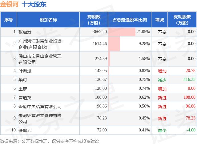 证券之星消息,4月26日金银河发布公告《金银河:关于持股5%以上股东权益变动触及1%及5%整数倍暨持股比例降至5%且披露简式权益变动报告书的提示性公告》,其股东广州海汇财富创业投资企业(有限合伙)于2026年4月22日至2026年4月23日间合计减持265.47万股,占公司目前总股本的1.5257%,变动期间该股股价上涨7.39%,截止4月23日收盘报46.06元。