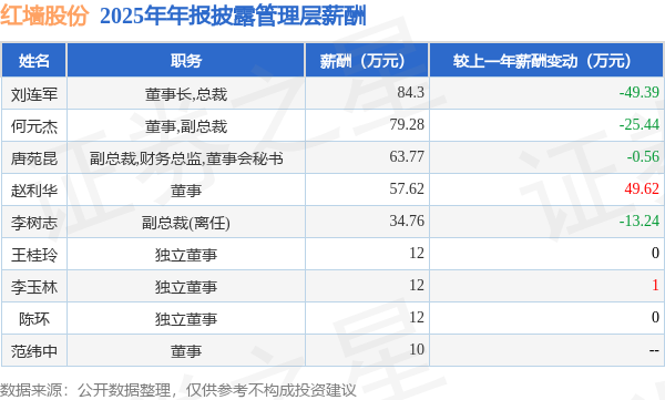 证券之星消息,红墙股份发布2025年年报,数据显示:公司主营收入7.69亿元,同比增13.84%。归母净利润为-3857.46万元,同比减179.11%。扣非净利润为-5208.75万元,同比减236.06%。当年公司员工总数561人,同比减3.11%。人均薪酬19.07万元(注:"人均薪酬"根据定期报告中"应付职工薪酬"附注的本期增加值 / 员工总数计算而来),同比增2.1%。人均创收137.05万元,同比增17.5%。其中管理层薪酬总额为365.73万元,同比上一年减25.37%,薪酬最高的为董事长,总裁刘连军,薪酬84.3万元。
