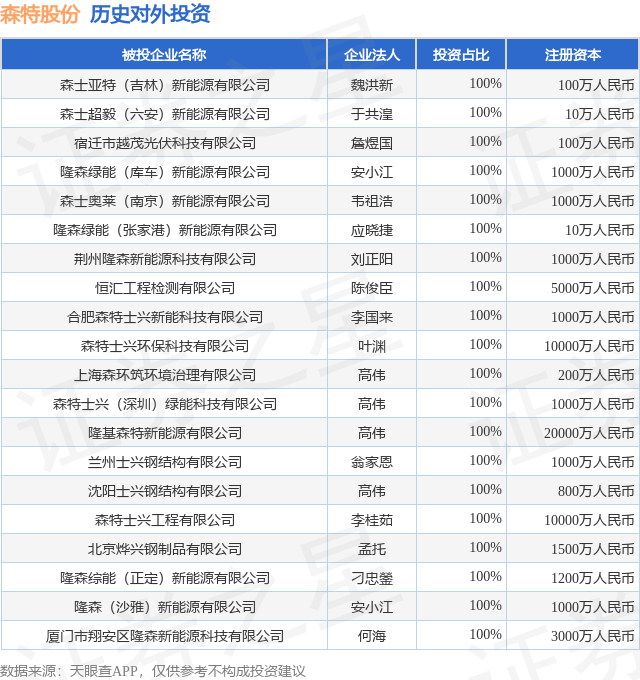 证券之星消息,根据天眼查APP显示,森特股份(603098.SH)新增一起对外投资事件,被投资公司为森士亚特(吉林)新能源有限公司,法定代表人魏洪新,投资占比为100%。该公司从事电力、热力生产和供应业,注册资本为100万人民币。目前,森特股份共存在对外投资45项,投资占比前20的项目见下表: