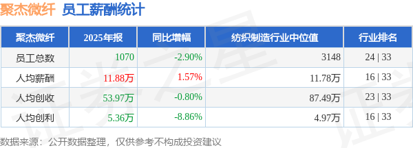 证券之星消息,4月27日聚杰微纤公布2025年年报,当年营收5.77亿元,同比减3.68%;净利润为5618.39万元,同比减12.82%。根据财报数据披露,当年公司员工总数1070人,同比减2.9%;人均薪酬11.88万元,同比增1.57%;人均创收53.97万元,同比减0.8%;人均创利5.36万元,同比减8.86%;公司员工薪酬统计见下表: