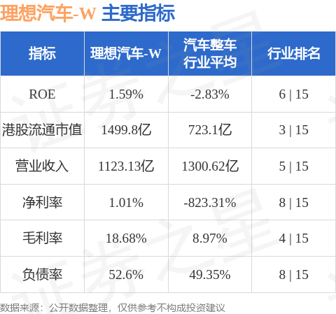 理想汽车-W港股市值1499.8亿港元,在汽车整车行业中排名第3。主要指标见下表:
