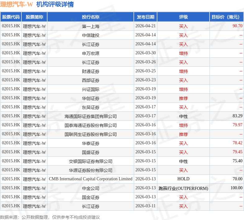 投行对该股的评级以买入为主,近90天内共有11家投行给出买入评级,近90天的目标均价为82.15港元。第一上海最新一份研报给予理想汽车-W买入评级,目标价90.7港元。