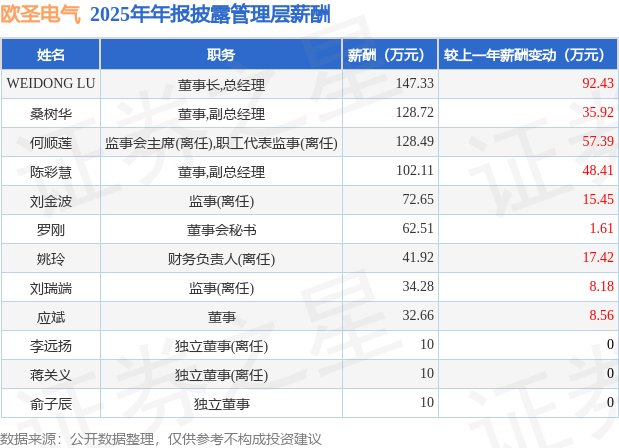 证券之星消息,欧圣电气发布2025年年报,数据显示:公司主营收入19.81亿元,同比增12.29%。归母净利润为1.05亿元,同比减58.77%。扣非净利润为1.02亿元,同比减57.77%。当年公司员工总数1510人,同比增14.74%。人均薪酬22.76万元(注:"人均薪酬"根据定期报告中"应付职工薪酬"附注的本期增加值 / 员工总数计算而来),同比增21.97%。人均创收131.18万元,同比减2.13%。人均创利6.92万元,同比减64.09%。其中管理层薪酬总额为780.67万元,同比上一年增46.91%,薪酬最高的为董事长,总经理WEIDONG LU,薪酬147.33万元。