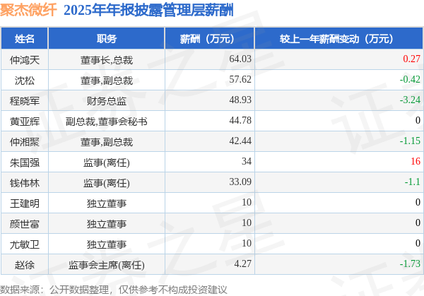证券之星消息,聚杰微纤发布2025年年报,数据显示:公司主营收入5.77亿元,同比减3.68%。归母净利润为5618.39万元,同比减12.82%。扣非净利润为5381.65万元,同比减18.41%。当年公司员工总数1070人,同比减2.9%。人均薪酬11.88万元(注:"人均薪酬"根据定期报告中"应付职工薪酬"附注的本期增加值 / 员工总数计算而来),同比增1.57%。人均创收53.97万元,同比减0.8%。人均创利5.36万元,同比减8.86%。其中管理层薪酬总额为359.16万元,同比上一年增2.46%,薪酬最高的为董事长,总裁仲鸿天,薪酬64.03万元。