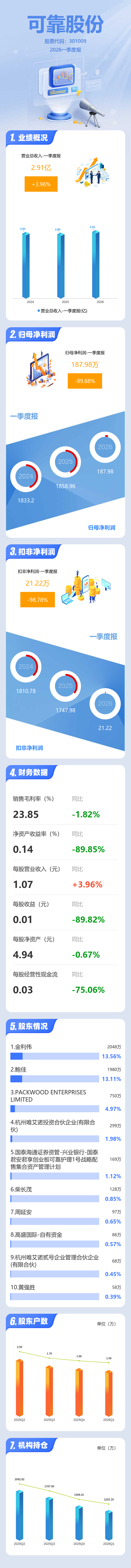证券之星消息,可靠股份2026年一季报显示,一季度公司主营收入2.91亿元,同比上升3.97%;归母净利润187.98万元,同比下降89.89%;扣非净利润21.22万元,同比下降98.79%;负债率33.75%,投资收益166.14万元,财务费用759.28万元,毛利率23.85%。