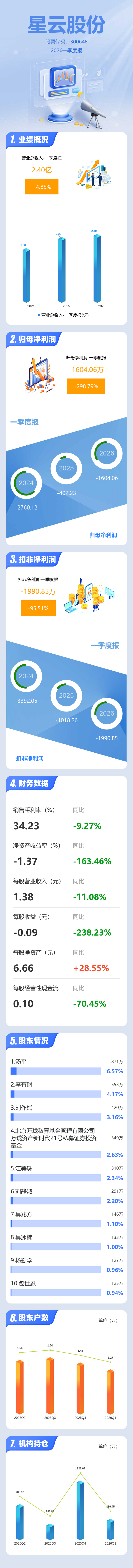 证券之星消息,星云股份2026年一季报显示,一季度公司主营收入2.4亿元,同比上升4.86%;归母净利润-1604.06万元,同比下降298.79%;扣非净利润-1990.85万元,同比下降95.51%;负债率57.98%,投资收益-68.87万元,财务费用465.9万元,毛利率34.23%。
