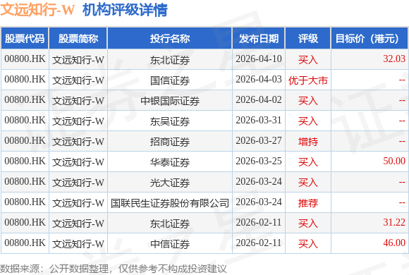 投行对该股的评级以买入为主,近90天内共有7家投行给出买入评级,近90天的目标均价为39.81港元。东北证券最新一份研报给予文远知行-W买入评级,目标价32.03港元。