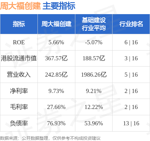 周大福创建港股市值367.57亿港元,在基础建设行业中排名第3。主要指标见下表: