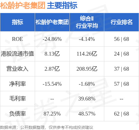松龄护老集团港股市值8.13亿港元,在综合Ⅱ行业中排名第24。主要指标见下表: