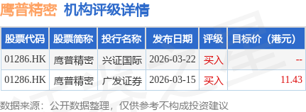 投行对该股的评级以买入为主,近90天内共有2家投行给出买入评级,近90天的目标均价为11.43港元。兴证国际最新一份研报给予鹰普精密买入评级。