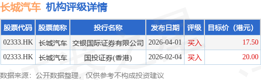 投行对该股的评级以买入为主,近90天内共有2家投行给出买入评级,近90天的目标均价为18.75港元。交银国际证券有限公司最新一份研报给予长城汽车买入评级,目标价17.5港元。