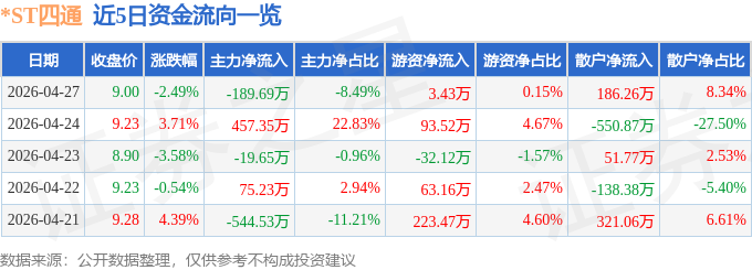 证券之星消息,截至2026年4月27日收盘,*ST四通(603838)报收于9.0元,下跌2.49%,换手率0.76%,成交量2.44万手,成交额2234.34万元。