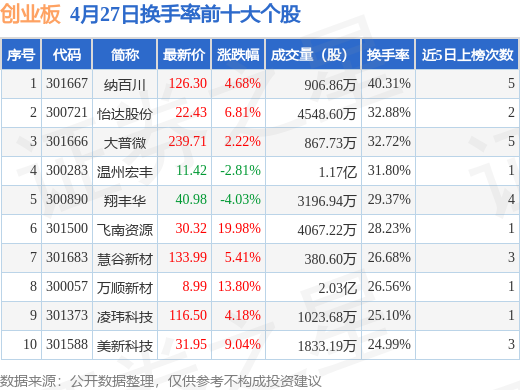 当日创业板换手率前10大个股中8只个股收涨,平均涨幅8.27%,其中纳百川(301667)以换手率40.31%排第一,6只个股近5个交易日中多次上榜。