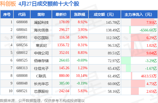 当日科创板成交额前10大个股中8只个股收涨,平均涨幅5.54%,其中澜起科技(688008)以成交额145.78亿元排第一。从主力资金流入看,成交额前10大个股中有7只个股呈现主力资金净流入。