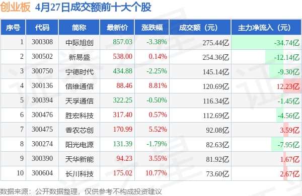 当日创业板成交额前10大个股中6只个股收涨,平均涨幅4.89%,其中中际旭创(300308)以成交额275.44亿元排第一。从主力资金流入看,成交额前10大个股中有4只个股呈现主力资金净流入。