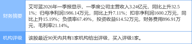 2026年3月20日,爱建证券研究员朱攀,吴迪发布了对艾可蓝的研报《首次覆盖报告:船舶业务快速扩大,携手艾昆纬布局AI医疗》,该研报对艾可蓝给出“买入”评级。证券之星数据中心根据近三年发布的研报数据计算,该研报作者对此股的盈利预测准确度为74.91%。