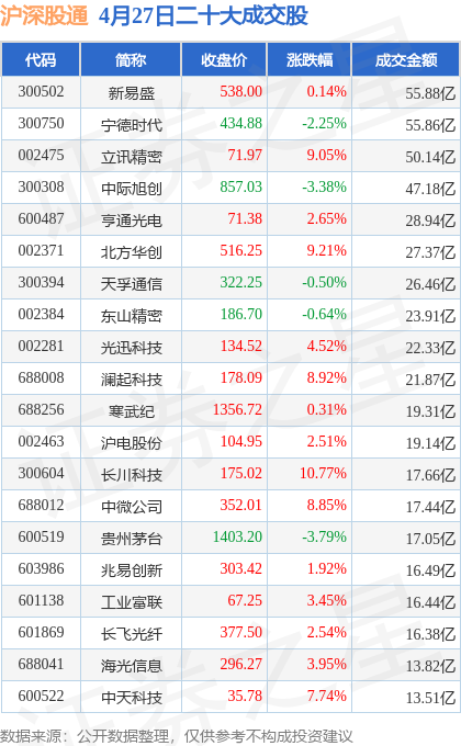 当日北向资金余额额度充足,东方明珠(600637)领涨,涨幅10.03%,交易所公布的沪深股通二十大成交股中成交额前三的为新易盛、宁德时代、立讯精密,成交额分别为55.88亿元、55.86亿元、50.14亿元。详情可见下表: