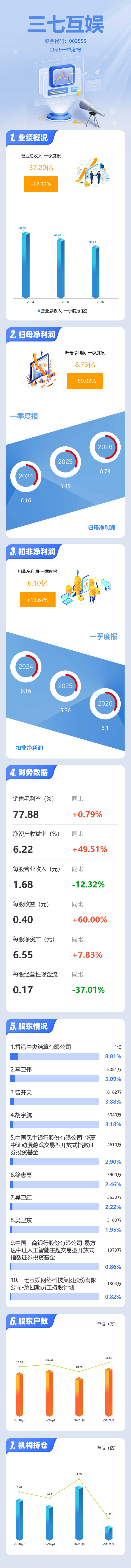 证券之星消息,三七互娱2026年一季报显示,一季度公司主营收入37.2亿元,同比下降12.32%;归母净利润8.73亿元,同比上升59.02%;扣非净利润6.1亿元,同比上升13.68%;负债率34.79%,投资收益3.59亿元,财务费用-2398.12万元,毛利率77.88%。