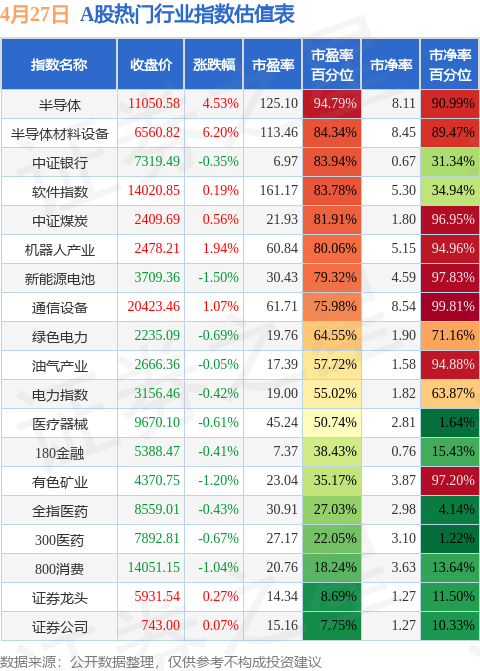 热门行业指数方面,半导体的市盈率百分位较高,为94.79%。而证券公司的市盈率百分位较低,为7.75%。