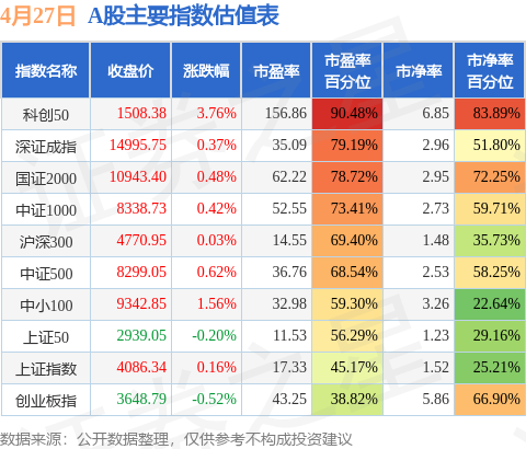 A股主要宽基指数方面,科创50的市盈率百分位较高,为90.48%。而创业板指的市盈率百分位较低,为38.82%。