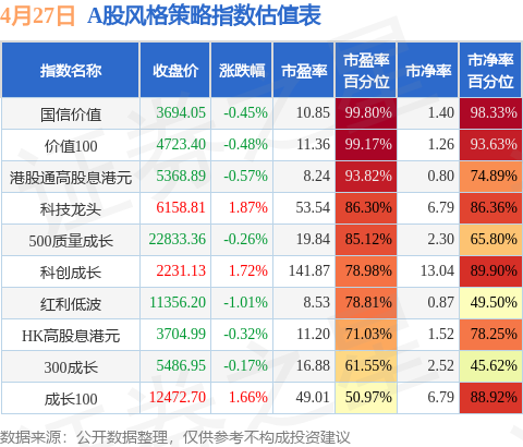 风格策略指数方面,国信价值的市盈率百分位较高,为99.8%。而成长100的市盈率百分位较低,为50.97%。