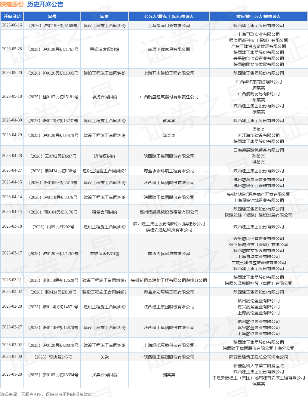案号:(2025)浙0113民初13737号根据统计,近一年内以陕西建工集团股份有限公司为当事人的历史开庭公告有158则,其中案由为“建设工程施工合同纠纷”的公告以40则居首,其次为“买卖合同纠纷”有26则,“建设工程分包合同纠纷”有18则。历史开庭公告(前20条)如下: