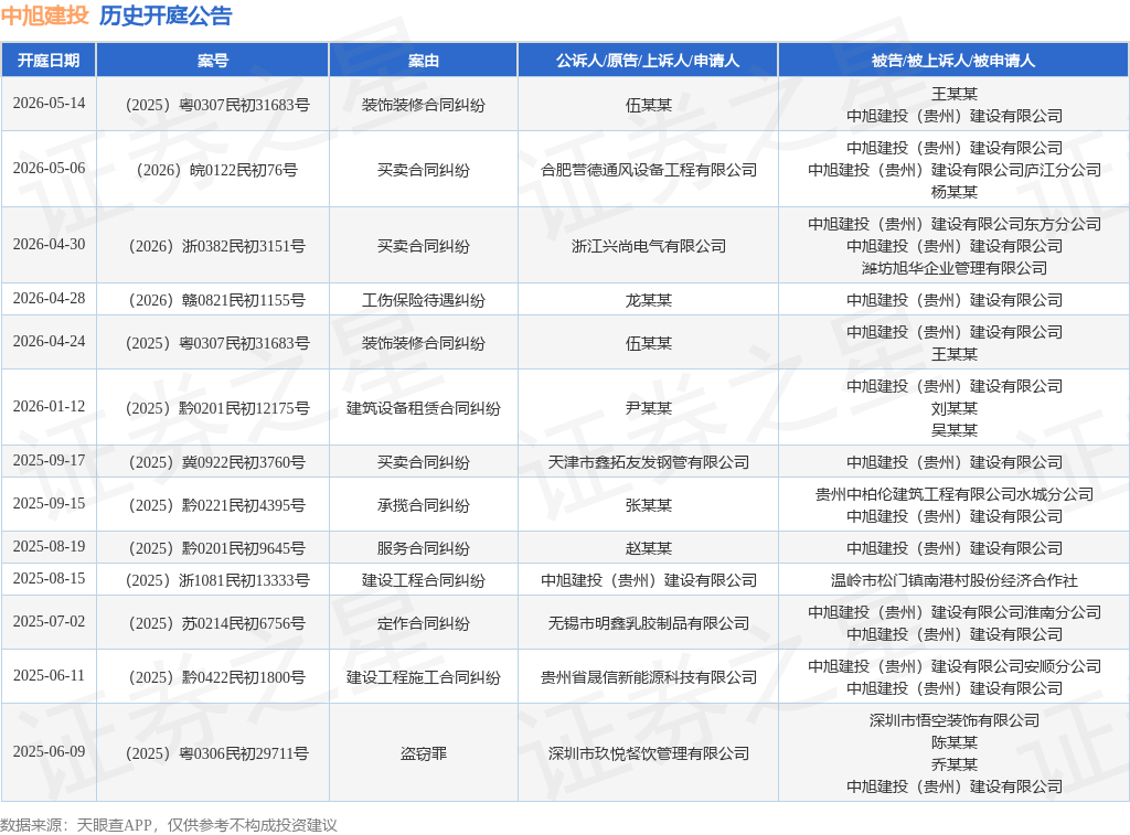 案号:(2026)浙0382民初3151号根据统计,近一年内以中旭建投(贵州)建设有限公司为当事人的历史开庭公告有13则,其中案由为“买卖合同纠纷”的公告以3则居首,其次为“装饰装修合同纠纷”有2则,“定作合同纠纷”有1则。历史开庭公告如下: